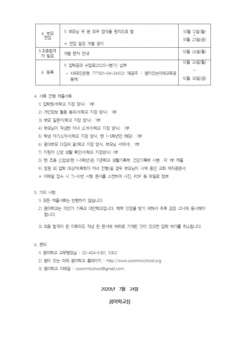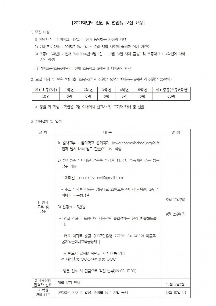 2021학년도 꿈미학교 신입생 및 편입생 모집 요강